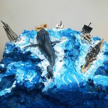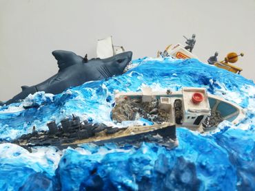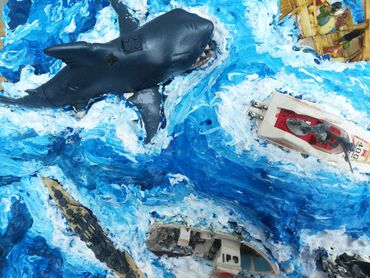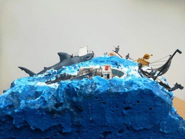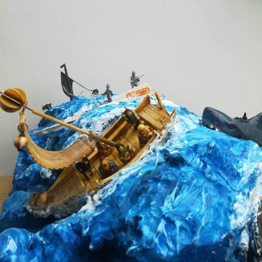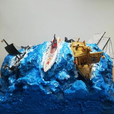 Experimenting with expanding foam and acrylic paint, to create a 3D art work of two ships in a sea storm, about to hit each other. The ships were found discarded at a car boot sale, and it was a shame to waste them.